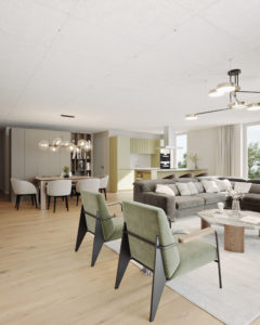 Bei den Innenvisualisierungen orientierten wir uns am Materialisierungskonzept und kombinierten verschiedene Farben und Materialien bestmöglich. Ein besonderes Augenmerk lag auf der Integration der Möblierung, passend zum Pistazie-Ton der Küche und zur Sichtbetondecke.